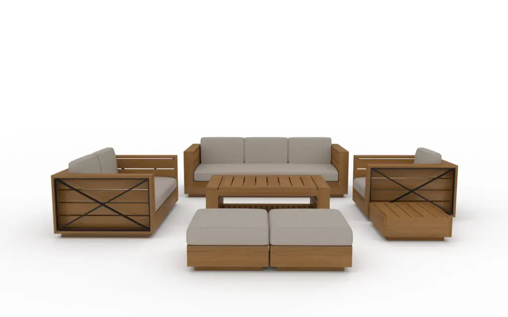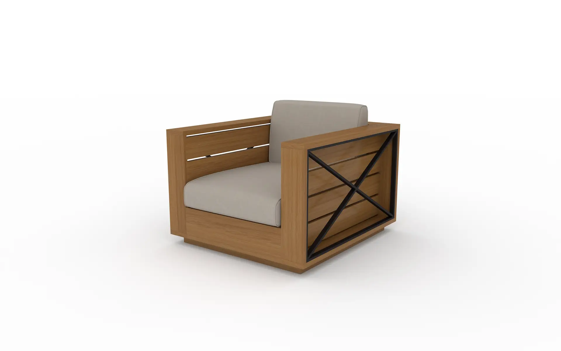 Silhouette Lounge Chair with Inside Arm Aluminum Detail Wood Offered in Teak or Carbonized Wood. Along with Semi-Attached Seat and Back Cushions